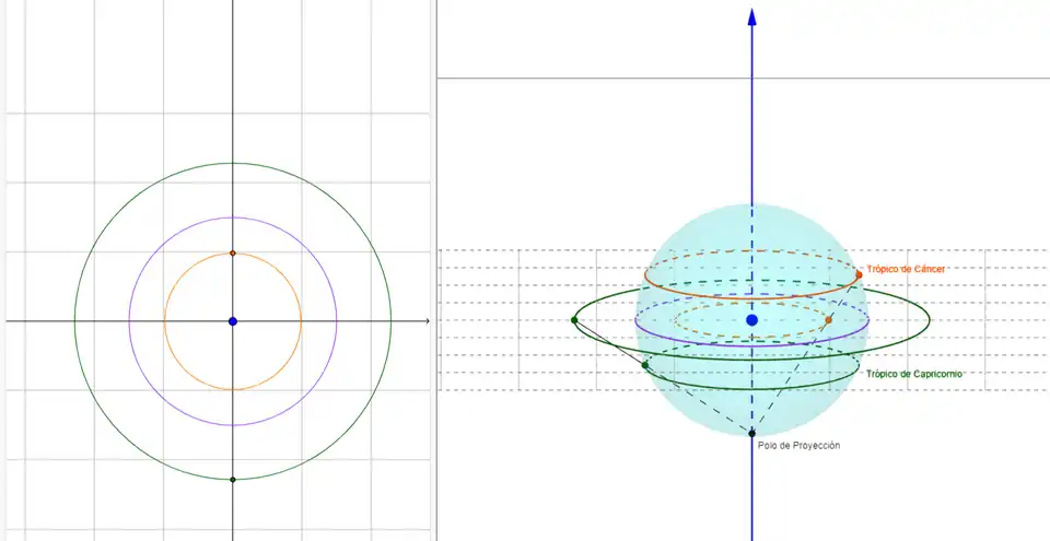 When projecting onto the celestial equatorial plane, three concentric circles correspond to the celestial sphere's three circles of latitude (left side of the image). The largest of these, the projection on the celestial equatorial plane of the celestial Tropic of Capricorn, defines the size of the astrolabe's tympanum. The center of the tympanum (and the center of the three circles) is actually the north-south axis around which Earth rotates, and therefore, the rete of the astrolabe will rotate around this point as the hours of the day pass (due to Earth's rotational motion).