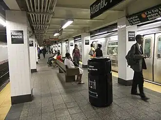 The Atlantic Avenue–Barclays Center station (formerly Atlantic Avenue/Pacific Street station) is a major New York City Subway station complex shared by the BMT Fourth Avenue Line, the BMT Brighton Line and the IRT Eastern Parkway Line. Named after Atlantic Avenue and the Barclays Center arena, it is located at Fourth and Flatbush Avenues' intersections with Atlantic Avenue and Pacific Street in Downtown Brooklyn. The complex is served by the 2, 4, D, N, Q and R trains at all times; the 3 train at all times except late nights; the 5 and B trains on weekdays during the day; and a few rush-hour W trains.