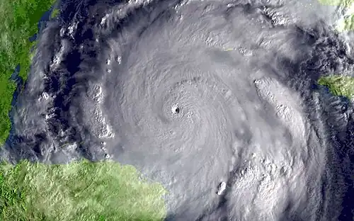 Hurricane Wilma on 19 October 2005. The pressure in the eye of the storm was 882 hPa (12.79 psi) at the time the image was taken.