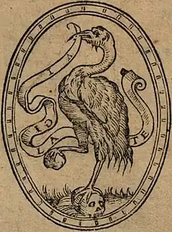 One peculiar attitude, reserved only to the pelican, is the pelican in her piety. The heraldic pelican, one of the few female beasts in heraldry, is shown with a sharp stork-like beak, which it uses to vuln (pierce or wound) her own breast. This is per the bestiary myth that a female pelican wounded herself thus to feed her chicks. This symbol of sacrifice carries a particular religious meaning (usually a reference to Christ's sacrifice), and became so popular in heraldry that pelicans rarely exist in heraldry in any other position.[31] A distinction is sometimes observed, however, between a pelican vulning herself (alone, piercing her breast) versus "her piety" (surrounded by and feeding her chicks).[32]