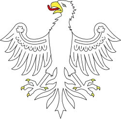 Other heraldic attitudes, such as volant (flying), describe the positions of birds, exemplified by the bird most usual to heraldry – the heraldic eagle; moreover, birds also are described by the positions of their wings.[1] The term naiant (swimming) applies to fish, swans, ducks, and geese. The term segreant is applied to the griffin, as an approximation of rampant, and is applied to the dragon. Animal figures are positioned in profile, facing dexter (the viewer's left), and persons are shown affronté (facing the viewer), but the blazon might specify other attitudes.
