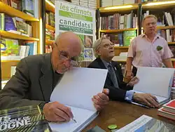 Aubert de Villaine (left) signs books with Bernard Pivot (center) at the 2013 Hospices de Beaune charity wine auction