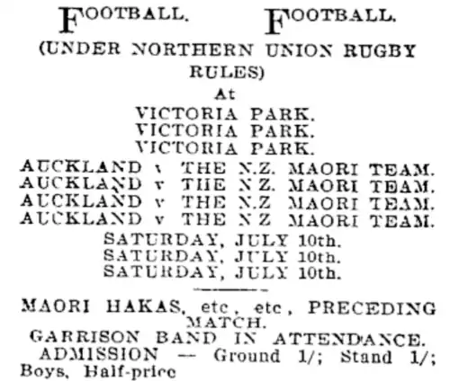 Advertisement for the Auckland v NZ Māori match at Victoria Park on July 10, 1909.