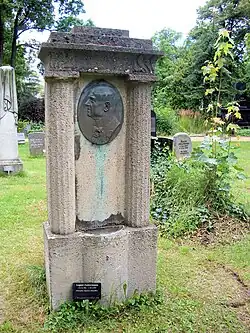 Junkermann died on 15 May 1915 in Berlin after a stroke at the age of 82.[3] The funeral took place on 18 May at the Cemetery III of the Jerusalems- und Neue Kirche in front of Hallesches Tor. The funeral service was conducted by Pastor Eduard Le Seur from Groß-Lichterfelde, a nephew of the deceased. A report in the Berliner Tageblatt regretfully noted that only a few fellow actors attended the funeral.[4] The surviving grave monument to Junkermann is a stele in the form of a columnar aedicule holding an oval portrait relief, the work of sculptor Fritz Richter-Elsner.[5]