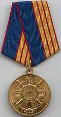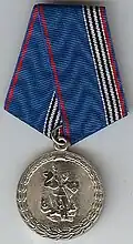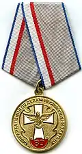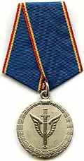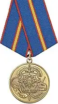 Awarded to employees of law enforcement bodies of the Russian Federation, to federal civil servants, to employees of the Interior Ministry of Russia, for high performance in service and diligence in the performance of tasks during a period of martial law, a state emergency, an anti-terrorist operation, in the context of an armed conflict, in the aftermath of accidents, natural or man-made disasters or other emergencies.[1][4][7] |