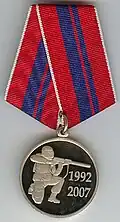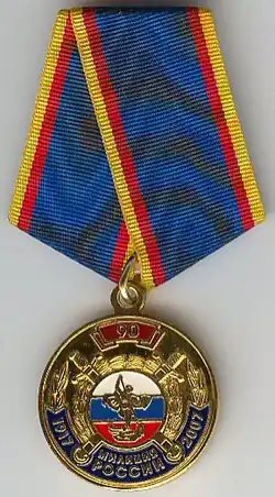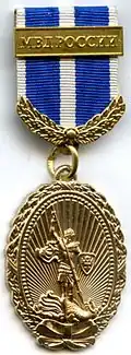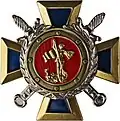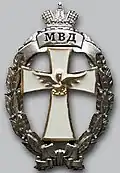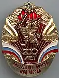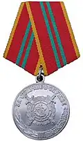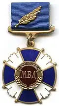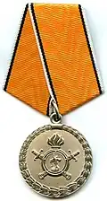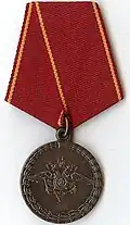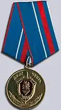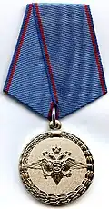 Awarded to military personnel of the troops of the Interior Ministry of the Russian Federation for excellent performance in training; for distinction in the performance of military duties; for merit in the protection of public order and public security; for courage, dedication and high achievements displayed during military service. Abrogated from the MVD awards system by order 602 of October 2013, it is no longer awarded.[19][1][2] |