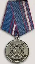 Awarded to members of the Interior Ministry, the military forces of the Interior Ministry of Russia, employees of the State Fire Service and in some cases to other citizens of the Russian Federation for courage and dedication while extinguishing fires, rescuing people and saving property from fire; for leadership in leading efforts in fire fighting and rescuing people; for courage, determination and high professionalism as demonstrated in preventing an explosion or fire. Abrogated from the MVD awards system by order 602 of October 2013, it is no longer awarded.[2][21] |