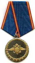 Awarded to employees of law enforcement bodies of the Russian Interior Ministry with at least 5 years of continuous service in one of the bodies of the Interior Ministry, for courage and selflessness demonstrated in the line of duty, for achieving high results in personal performance, for marked improvement of professional skills, for the development and introduction of new working methods to improve the efficiency of MVD bodies.[1][4] |