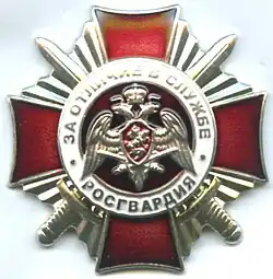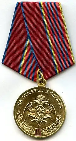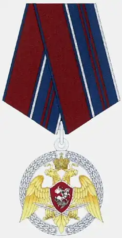 Awarded to military personnel, employees and federal civil servants of the Troops of the National Guard of the Russian Federation; for excellent performance in combat (professional, leadership) training, during professional service activities; for specific distinction, displayed military bearing in service, high performance indicators in military service (operational duty, service, combat) tasks and exercises; for high results in service and combat, in operational performance, in performance management; for achievements in the protection of public order and public security; for active work in the protection of public order, combating crime and the fight against terrorism and extremism; for bravery, dedication and other merit displayed during military service (work); for excellent and efficient civil service. The medal is awarded in 3 classes awarded successively from the lowest to the highest degree, the medal 1st class being the higher.[2][3] |