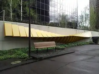 Awning is an outdoor 1976 painted aluminum sculpture by Canadian artist Douglas Senft, located near Southwest 3rd Avenue and Southwest Market Street in downtown Portland, Oregon.[1] The 60-foot (18 m) sculpture was selected and funded by the Portland Development Commission from more than 200 proposals in a request for art intended to "humanize the modern architecture" of the Portland Center. Senft was 26 years old when Awning was installed.[2] It is part of the collection of the Regional Arts & Culture Council.[2][3] The yellow-colored work is mounted to the side of 200 Market along a pedestrian trail that serves as an extension of Third Avenue.
