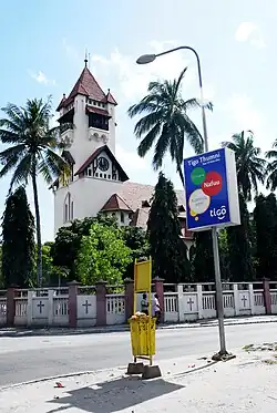 The Azania Front Lutheran Church is a Lutheran church in Dar es Salaam, Tanzania, serving as a cathedral for the local diocese. It is among the most well-known landmarks and tourist attractions of the city. It is in the city center, close to the ocean, facing the harbour. It was built by the German missionaries in 1898, in the Bavarian style of the time, with a red-tiled roof, tiled canopies over the windows and bright white walls.[1]