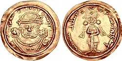During her brief reign, Azarmidokht had coins minted with the image of her father on the obverse, with the inscription khwarrah abzūd ("Increase in Glory") and the winged crown representing Verethragna, the name of the god of victory.[15] On the reverse there is the regular late Sasanian fire-altar with two custodians.[15] Her reason for putting her father was not due to her gender, but primarily to emphasize her legitimacy by relation to the royal Sasanian family, and most importantly to Khosrow II, who was considered the last rightful king of Iran.[15] Azarmidokht's reason for minting coins with the image of her father was thus to restore his image and that of the Sasanian house, an attempt which was first made by Azarmidokht's sister, Boran, who did not however use an image of their father, but instead resorted to pay tribute to him by referring to him in her inscriptions.[16] However, at the time when Azarmidokht ascended the throne, an inscription may have not been enough, thus resulting in the placement of Khosrow II's image on the obverse of the coins.[8]