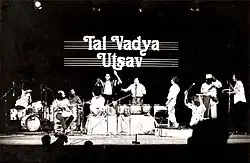 Babatunde Olatunji, second from right, at the Tal Vadya Utsav International Drums & Percussion Festival, Siri Fort Auditorium, New Delhi, 1985