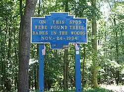 • In 1968, Pennsylvania highway workers installed a blue and yellow sign which reads, "On this spot were found three babes in the woods — Nov. 24, 1934"[20] The site is at 40°03.956′N 77°18.299′W / 40.065933°N 77.304983°W / 40.065933; -77.304983.[21]