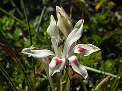 Babiana tubiflora is a species of geophyte of 7–15 cm (2.8–5.9 in) high that is assigned to the family Iridaceae. It has whitish mirror-symmetrical flowers with a long narrow tube that split into six tepal lobes, have three stamens, and line- to lance-shaped, laterally compressed leaves.[1] It is an endemic species of South Africa that can be found along the west and south coast of the Western Cape province. It flowers from August to early October.[3]