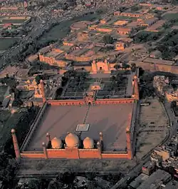The sixth Mughal Emperor, Aurangzeb, chose Lahore as the site for his new mosque. Aurangzeb, unlike the previous emperors, was not a major patron of art and architecture and instead focused, during much of his reign, on various military conquests which added to the Mughal realm.[6] The mosque was built to commemorate Aurangzeb's military campaigns in southern India, in particular against the Maratha ruler Shivaji.[5] As a symbol of the mosque's importance, it was built directly across from the Lahore Fort and its Alamgiri Gate, which was concurrently built by Aurangzeb during construction of the mosque.[7][4]
