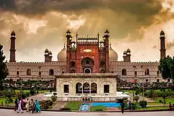 The Badshahi Mosque (Punjabi: شاہی مسیت, romanized: śāhī masīt; Urdu: بادشاہی مسجد, romanizedbādśāhī masjid) is a Mughal-era imperial mosque located in Lahore, Punjab, Pakistan.[1][2] It was constructed between 1671 and 1673 during the rule of Aurangzeb, opposite of the Lahore Fort on the northern outskirts of the historic Walled City. It is widely considered to be one of the most iconic landmarks of Pakistan.[3][4]