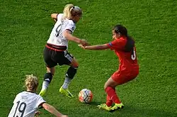 Bahar Güvenç (red) trying to stop a German attack at the UEFA Women's Euro 2017 qualifying Group 5 match in Istanbul, Turkey.