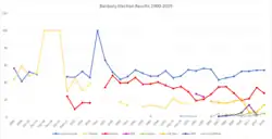 Four of the six parties' candidates achieved more than the deposit-retaining threshold of 5% of the vote in 2015. In 2001, the Labour Party candidate Lesley Silbey won the largest opposing-party share of the vote since 1974 — 35% of the vote. Prior to 1974, the highest percentage of votes for the second-placed candidate was in 1945 — 48% of the vote.