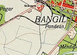 To the south of the station, behind an abandoned locomotive depot there was branch connected to Pandaan and Japanan operated by a private tramway company named Modjokerto Stoomtram Maatschappij (MdjSM) or Mojokerto Steam Tramway as for Bangil-Japanan-Mojokerto rail line which opened on May 4, 1919. The line itself was used for the freight route and along this line, there were Panda'an (Ardiredjo) and Japanan sugar mills. Actually, this line was a displacement railway line for MdjSM from the first line which was inaugurated on September 18, 1899.[10] The first MdjSM line used this station from track no.1 to the east (to Pasuruan) and then curved to the south passing behind the prison. Then, around 1914 Staatsspoorwegen (SS) proposed a line construction using the actual Modjokerto tramway's line map to the north (Kaliredjo) which connected to Sumberredjo sugar mill as a freight route service and this also impacted the operation of MdjSM's asset with the move of their railway line. The move of MdjSM railway line to the south because the line to Sumberredjo was actually belonged to MdjSM as part of Panda'an-Bangil line based on Colonial Government's Decree No.1 on 31 of December 1895. After line to Panda'an finished and opened in 1899, the MdjSM didn't execute the line construction to the north (Kaliredjo) which connected to the sugar mill and they considered it less profitable for their business operations. Finally, this line was taken over by State Railway or Staatsspoorwegen to build it which started from track number one from this station connected to Sumberredjo passing Bangil town square (just north from the station) around 1914-16 and finished in 1919.[11]