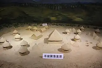 Banpo is a Neolithic archaeological site located in the Yellow River valley, east of present-day Xi'an, China. Discovered in 1953 by Shi Xingbang,[1] the site represents the first phase of the Yangshao culture (c. 5000 – c. 3000 BCE) and features the remains of several well organized settlements—including Jiangzhai, which has been radiocarbon dated to c. 4700 – c. 3600 BCE).[2][3][4][5] An area of 5 to 6 hectares (12 to 15 acres) was surrounded by a ditch, probably a defensive moat 5 to 6 meters (16 to 20 ft) wide. The houses at Banpo were circular, built of mud and wood on low foundations, with overhanging thatched roofs. There also appear to have been communal burials.[6]