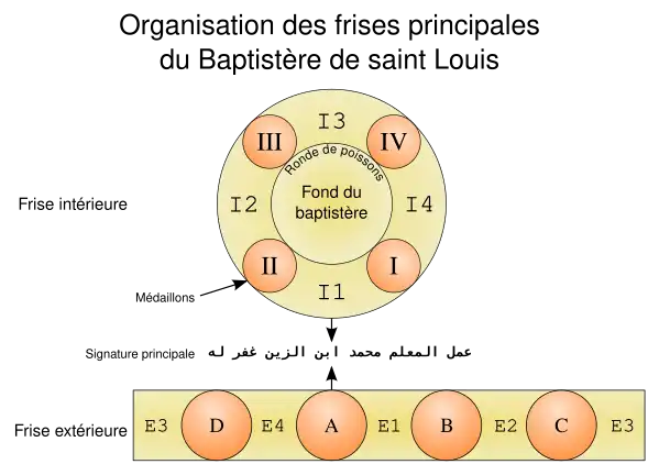 - The Baptistery of Saint Louis has sixteen medallions bearing emblems in the interior and exterior animal friezes. These blazons were modified at an unknown date and replaced a fleur de lis, which could make one think that it was a French rectification; however, D.S. Rice believes that this is an Oriental-style fleur de lis, used both in the Ayyubid dynasty and in the Qalâ'ûn house. He also identified the two pieces of furniture originally found on the coats of arms: a lion crawling to the right (present on half of the outer faces) and an element consisting of a circle surmounted by a stem with two rectangles. D. S. Rice speaks of a tamga, that is to say, an identity symbol used since ancient times by the Turk-Mongols. Rice picks up there an identification of L.A. Mayer, but the form knows no equivalent and its owner could not be identified; E. Knauer proposes to see a tamga specially created for Berke, son of Baybars, but without bringing any element allowed to go beyond the stage of the hypothesis. Sophie Makariou prefers to see a key, which links to a coat of arms to a four-keyed cross on the lintel of the monastery of Nicolas-des-Chats in Akrotiri (Cyprus). The lion also poses a problem by its form, since it is never represented as stalking, but always passing, in Islamic heraldry. This challenged his identification as the emblem of the sovereign Baybars; S. Makariou interprets this as the coat of arms of the Lusignan family.
