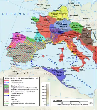 Early barbarian rulers were tolerated only on the terms of the Roman Empire. Early 'kingdoms', such as those of the Suebi and Vandals in Hispania, were consequently relegated to the edges of less important provinces.[33] In 418, the Visigothic groups formerly under Alaric were settled by Emperor Honorius (r. 393–423) in Aquitania in southern Gaul, establishing the Visigothic Kingdom.[34][28] The Romans envisioned this as a provisional settlement of loyal clients of the imperial government, whose support could be relied on in internal struggles. The settlement was not seen as an actual ceding of imperial territory, given that the Roman administration was also envisioned as continuing in the granted lands, albeit overseen by the Visigoths as vassals.[28] Though some Roman generals in the time of Honorius had worked to curb the influence and power of the barbarian rulers, the number of civil wars that followed Honorius's death made the status of the barbarians a secondary concern. Instead of suppressing the barbarian kings, emperors and usurpers in the fifth century viewed them as useful internal players.[33]