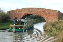 A narrowboat approaches a bridge over the Oxford Canal west of Barby