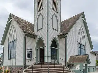 Built in 1898, as Bardsdale Methodist Episcopal Church, this carpenter Gothic structure with a 60 ft (18 m) bell tower and high-peaked arches has long been a center of community life in Bardsdale. The town's namesake, Thomas R. Bard, donated the land for construction of the church and parsonage. He also donated funds to help purchase two large stained glass windows installed in the north and west walls.[3]