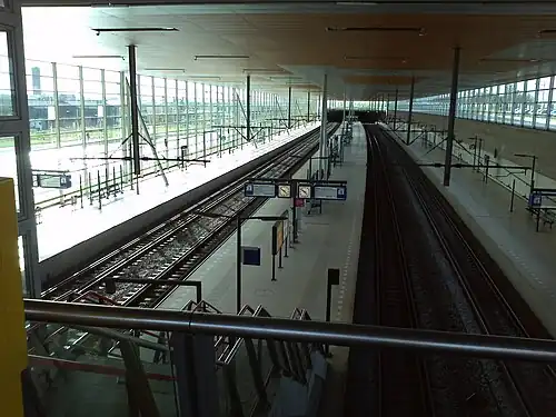 Barendrecht railway station is a railway station in Barendrecht, Netherlands, located on the Breda–Rotterdam railway between Rotterdam and Dordrecht. Adjacent to the four tracks of this line are two tracks for the HSL-Zuid and three for freight, as part of the Betuweroute freight route to Zevenaar. The nine tracks are in a 1.5 kilometers (0.93 mi) long roofed structure, much of it covered under a layer of earth, to keep noise at bay. On top is a new city park. At the station itself its four tracks, with the platforms, have a glass roof.