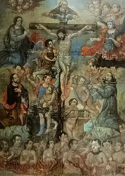 Baroque churches were designed with a large central space, where the worshippers could be close to the altar, with a dome or cupola high overhead, allowing light to illuminate the church below. The dome was one of the central symbolic features of Baroque architecture illustrating the union between the heavens and the earth. The inside of the cupola was lavishly decorated with paintings of angels and saints, and with stucco statuettes of angels, giving the impression to those below of looking up at heaven.[24] Another feature of Baroque churches are the quadratura; trompe-l'œil paintings on the ceiling in stucco frames, either real or painted, crowded with paintings of saints and angels and connected by architectural details with the balustrades and consoles. Quadratura paintings of Atlantes below the cornices appear to be supporting the ceiling of the church. Unlike the painted ceilings of Michelangelo in the Sistine Chapel, which combined different scenes, each with its own perspective, to be looked at one at a time, the Baroque ceiling paintings were carefully created so the viewer on the floor of the church would see the entire ceiling in correct perspective, as if the figures were real.