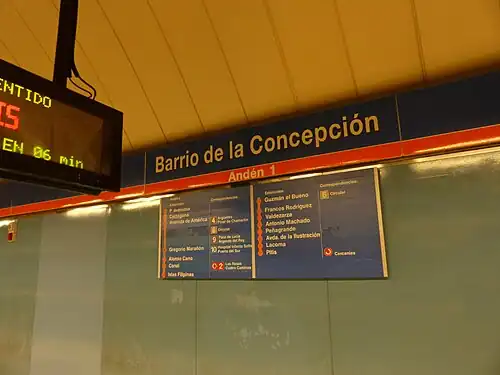 Barrio de la Concepción [ˈbarjo ðe la konθeβˈθjon] is a station on Madrid Metro Line No. 7 in the district of Ciudad Lineal, serving the barrio of Concepción.[1]