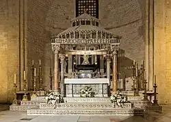 The Basilica houses one of the most noteworthy Romanesque sculptural works of southern Italy, a cathedra (bishop's throne) finished in the late eleventh century for Elias. There are precious mosaic pavements in the crypt and presbytery. The ciborium, the most ancient in the region, is also decorated with mosaic; it has four columns with foliage, animals and mythological figures. The crypt, with 26 columns sporting capitals in Byzantine and Romanesque style, houses the relics of Saint Nicholas.