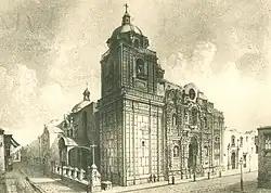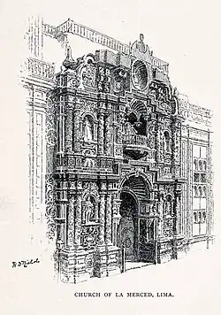 The Basilica and Priory of Nuestra Señora de la Merced is a Roman Catholic church located in Lima, Peru. It was designed in the Baroque style known as Churrigueresque. The church was built under the supervision of Friar Miguel de Orenes in 1535. The Blessed Virgin Mary of Mercy, the patroness of the Peruvian Armed Forces, is venerated in the Basilica. The Mercedarians, who evangelized the region, helped to develop Lima by building many of the churches preserved today.[1]