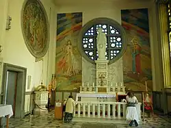 Entering the church, a visitor can see the statue of Our Lady Immaculate in the main altar. This statue is a work of Maurycy Kowalewski and Abel Dziełyński, friars-sculptors from Niepokalanów. In the chapel of St. Joseph (on the right side of the church) there are two important mosaics. The first of them (round mosaic) commemorates the baptism of Poland. The Latin inscription says: Mesco dux baptizatur – Polonia semper fidelis - 966-1966 (Prince Mieszko baptized – Poland is always faithful – 966-1966).[6] The second, huge mosaic (placed on the wall) shows Jesus the Merciful and the Immaculate Heart of Our Lady.