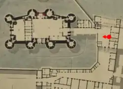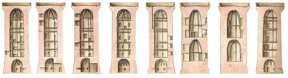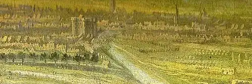 Structurally, the late-18th century Bastille was not greatly changed from its 14th-century predecessor.[89] The eight stone towers had gradually acquired individual names: running from the north-east side of the external gate, these were La Chapelle, Trésor, Comté, Bazinière, Bertaudière, Liberté, Puits and Coin.[90] La Chapelle contained the Bastille's chapel, decorated with a painting of Saint Peter in chains.[91] Trésor took its name from the reign of Henry IV, when it had contained the royal treasury.[92] The origins of the name of Comté tower are unclear; one theory is that the name refers to the County of Paris.[93] Bazinière was named after Bertrand de La Bazinière, a royal treasurer who was imprisoned there in 1663.[92] Bertaudière was named after a medieval mason who died building the structure in the 14th century.[94] Liberté tower took its name either from a protest in 1380, when Parisians shouted the phrase outside the castle, or because it was used to house prisoners who had more freedom to walk around the castle than the typical prisoner.[95] Puits tower contained the castle well, while Coin formed the corner of the Rue Saint-Antoine.[94]