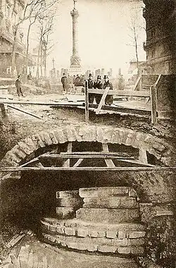A number of histories of the Bastille were published immediately after July 1789, usually with dramatic titles promising the uncovering of secrets from the prison.[232] By the 1830s and 1840s, popular histories written by Pierre Joigneaux and by the trio of Auguste Maquet, Auguste Arnould and Jules-Édouard Alboize de Pujol presented the years of the Bastille between 1358 and 1789 as a single long period of royal tyranny and oppression, epitomised by the fortress; their works featured imaginative 19th-century reconstructions of the medieval torture of prisoners.[233] As living memories of the Revolution faded, the destruction of the Bastille meant that later historians had to rely primarily on memoires and documentary materials in analysing the fortress and the 5,279 prisoners who had come through the Bastille between 1659 and 1789.[234] The Bastille's archives, recording the operation of the prison, had been scattered in the confusion after the seizure; with some effort, the Paris Assembly gathered around 600,000 of them in the following weeks, which form the basis of the modern archive.[235] After being safely stored and ignored for many years, these archives were rediscovered in 1840 (under the kitchen floor at the Arsenal library) by the French historian François Ravaisson,[236] who catalogued and used them for research between 1866 and 1904.[237]