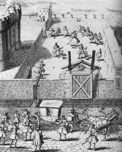 Under Louis, only between 20 and 50 prisoners were usually held at the Bastille at any one time, although as many as 111 were held for a short period in 1703.[70] These prisoners were mainly from the upper classes, and those who could afford to pay for additional luxuries lived in good conditions, wearing their own clothes, living in rooms decorated with tapestries and carpets or taking exercise around the castle garden and along the walls.[73] By the late 17th century, there was a rather disorganised library for the use of inmates in the Bastille, although its origins remain unclear.[75][F]