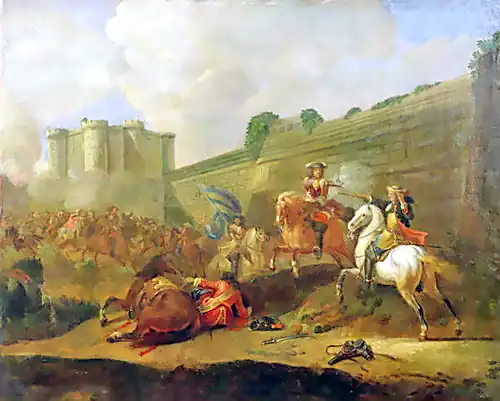 During the Second Fronde, between 1650 and 1653, Louis, the Prince of Condé, controlled much of Paris alongside the Parlement, while Broussel, through his son, continued to control the Bastille. In July 1652, the Battle of the Faubourg St Antoine took place just outside the Bastille. Condé had sallied out of Paris to prevent the advance of the royalist forces under the command of Turenne.[59] Condé's forces became trapped against the city walls and the Porte Saint-Antoine, which the Parlement refused to open; he was coming under increasingly heavy fire from the Royalist artillery and the situation looked bleak.[60] In a famous incident, La Grande Mademoiselle, the daughter of Gaston, Duke of Orléans, convinced her father to issue an order for the Parisian forces to act, before she then entered the Bastille and personally ensured that the commander turned the fortress's cannon on Turenne's army, causing significant casualties and enabling Condé's army's safe withdrawal.[61] Later in 1652, Condé was finally forced to surrender Paris to the royalist forces in October, effectively bringing the Fronde to an end: the Bastille returned to royal control.[52]