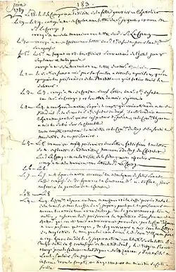 Louis reformed the administrative structure of the Bastille, creating the post of governor, although this post was still often referred to as the captain-governor.[77] During Louis's reign the policing of marginal groups in Paris was greatly increased: the wider criminal justice system was reformed, controls over printing and publishing extended, new criminal codes were issued and the post of the Parisian lieutenant general of police was created in 1667, all of which would enable the Bastille's later role in support of the Parisian police during the 18th century.[78] By 1711, a 60-strong French military garrison had been established at the Bastille.[79] It continued to be an expensive institution to run, particularly when the prison was full, such as during 1691 when numbers were inflated by the campaign against French Protestants and the annual cost of running the Bastille rose to 232,818 livres.[80][G]