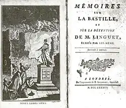 In the 1780s, prison reform became a popular topic for French writers and the Bastille was increasingly condemned as a symbol of arbitrary despotism.[150] Two authors were particularly influential during that period. The first was Simon-Nicholas Linguet, who was arrested and detained at the Bastille in 1780, after publishing a critique of Maréchal Duras.[151] After his release, he published his Mémoires sur la Bastille in 1783, a damning critique of the institution.[152] Linguet criticised, sometimes inaccurately, the physical conditions in which he was kept, but went further by capturing in detail the more psychological effects of the prison regime upon an inmate.[153][P] Linguet also encouraged Louis XVI to destroy the Bastille, publishing an engraving depicting the king announcing to the prisoners "may you be free and live!", a phrase borrowed from Voltaire.[144]