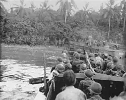 In an effort to reinvigorate the offensive, Sugg arrived on Arundel on 15 September to oversee a renewed attack supported by the Marine tanks, which arrived on the Bomboe Peninsula via landing craft from Munda. He began a series of coordinated assaults utilizing the tanks to provide close support to his infantry. The fighting continued for another week as the Japanese were forced into a small perimeter on the Stima Peninsula.[19][18] Exploiting the sound of a heavy downpour to muffle the noise of their engines, five tanks from the 11th Defense Battalion moved into position behind the 27th on the west coast on the night of 16–17 September. The following morning the five tanks, operating in two waves with infantry support, destroyed a Japanese strongpoint, allowing the front line to advance 500 yards (460 m). There were no losses amongst the tanks during this first engagement, but the following day Japanese defenders firing 37 mm guns destroyed two tanks, which had become isolated from infantry support after adopting the wrong formation.[20] The crews were rescued from their vehicles, though, as the supporting infantry recovered from their initial surprise and laid down supporting fire.[21]