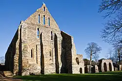 Battle Abbey was founded by William at the site of the battle. According to 12th-century sources, William made a vow to found the abbey, and the high altar of the church was placed at the site where Harold had died.[101] More likely, the foundation was imposed on William by papal legates in 1070.[135] The topography of the battlefield has been altered by subsequent construction work for the abbey, and the slope defended by the English is now much less steep than it was at the time of the battle; the top of the ridge has also been built up and levelled.[78] After the Dissolution of the Monasteries, the abbey's lands passed to secular landowners who used it as a residence or country house.[136] In 1976 the estate was put up for sale and purchased by the government with the aid of some American donors who wished to honour the 200th anniversary of American independence.[137] The battlefield and abbey grounds are currently owned and administered by English Heritage and are open to the public.[138]