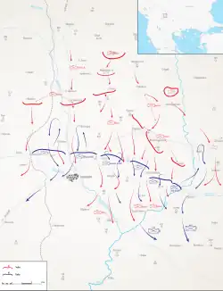 At the other side, as soon as his forces were deployed, Zeki Pasha decided to take the offensive towards Kumanovo. In the evening of 22 October, Vardar Army gathered in the valley of Pčinja River. While Zeki Pasha had the precise information about the strength and disposal of the Serbian forces, the Serbian command did not realise that the battle with the main Ottoman force would start the very next morning.[10] Not expecting the attack, Serbs did not fortify their positions, which were topographically strong. Still, only two out of five infantry divisions were deployed in the front echelon – Danube Division I on the left wing, with the Cavalry Division behind it, and Morava Division I on the right wing. The left flank was particularly vulnerable, because Srtevica, the important topographic object, was defended by local irregulars.[1]