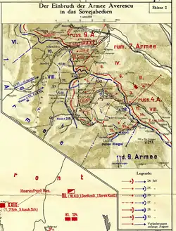 By 30 July, the 2nd Army had won a 35 km (22 mi) wide and about 20 km (12 mi) deep bridgehead into the 1st Austro-Hungarian Army’s front. The offensive was stopped because the Allied Command had to adjust its initial plans. The new plan moved the 9th Russian Army from the Western Moldavian front to the Northern front to stop the successful offensive of the 3rd and 7th Austro-Hungarian Armies from Bukovina, which started on 19 July. Moreover, the 1st and 2nd Romanian Armies, along with the 4th Russian Army, had to expand their area of responsibility to compensate for the withdrawal of the 9th Russian Army.[6][7]