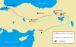 The march across Asia Minor was long and difficult. Romanos brought a luxurious baggage train, which did not endear him to his troops. The local population also suffered plundering by his Frankish mercenaries, whom he was obliged to dismiss. The expedition rested at Sebasteia on the Halys River, reaching Theodosiopolis in June 1071. Some of his generals suggested continuing the march into the Seljuk territory and catching Alp Arslan before he was ready. Others, including Nicephorus Bryennius, suggested they wait and fortify their position. It was decided to continue the march.[24] Then they moved to Khnus city. The Byzantine army, which was heading towards the Malazgirt Plain, chose the route of the Kocasu Stream flowing through Khnus as a route to meet its water needs, and the army manufactured the spears to be used in the war from the trees growing in Khnus and its surroundings.[25]