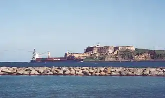 Ship entering the San Juan Bay, in front of Fort San Felipe del Morro - view from Isla de Cabras.