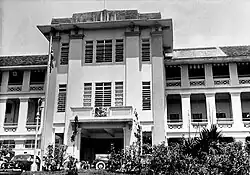 A delegation was selected to go to the Japanese headquarters. It consisted of a senior staff officer, the colonial secretary and an interpreter. The three set off in a motor car bearing a Union Jack and a white flag of truce toward the enemy lines to discuss a cessation of hostilities.[141] They returned with orders that Percival himself proceed with staff officers to the Ford Motor Factory, where Yamashita would lay down the terms of surrender. A further requirement was that the Japanese Rising Sun Flag be hoisted over the Cathay Building, the tallest building in Singapore.[142] Percival formally surrendered shortly after 17:15.[120] Earlier that day, Percival had issued orders to destroy all secret and technical equipment, ciphers, codes, secret documents and heavy guns.[143]