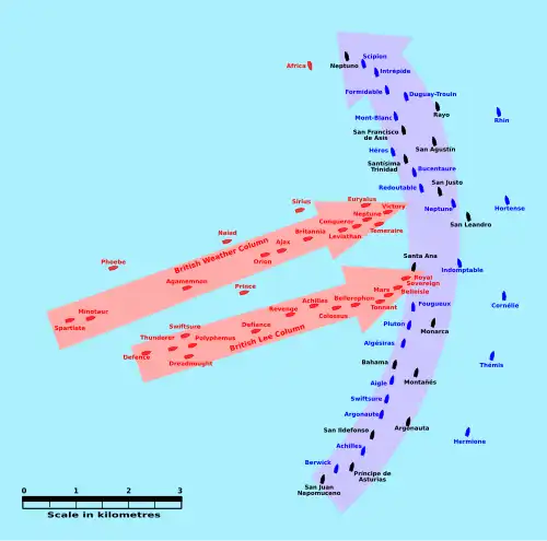 Nelson's solution was to cut the opposing line in three. Approaching in two columns sailing perpendicular to the Franco-Spanish fleet's line, one towards the centre of the opposing line and one towards the trailing end, his ships would surround the middle third, and force them to fight to the end.[43] Nelson hoped specifically to cut the line just in front of the French flagship, Bucentaure; the isolated ships in front of the break would not be able to see the flagship's signals, which he hoped would take them out of combat while they re-formed. This echoed the tactics used by Admiral Duncan at the Battle of Camperdown and Admiral Jervis at the Battle of Cape St. Vincent, both in 1797.[44]