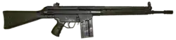 The Heckler & Koch G3 (Gewehr 3) is a roller-delayed blowback operating system rifle developed in the 1950s by the German armament manufacturer Heckler & Koch (H&K) in collaboration with the Spanish state-owned design and development agency CETME (Centro de Estudios Técnicos de Materiales Especiales), firing 7.62×51mm NATO from 5, 10, 20, 30, or 40 round detachable box magazines and 50 or 100 round detachable drum magazines.[12] It was first produced in 1959. The modular designed G3 has over the years been exported to over 70 countries and manufactured under licence in at least 15 countries, bringing the total number built to around 7,800,000.[13]